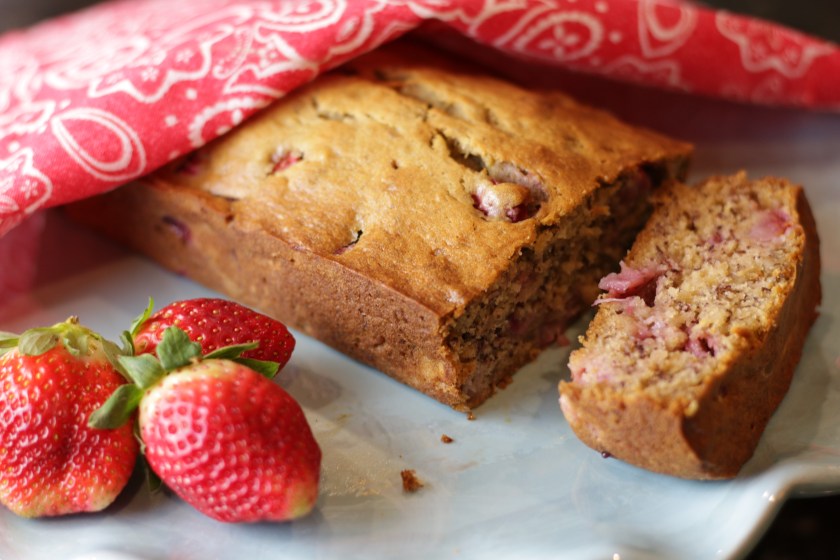 - Sift all dry ingredients: flour, salt, and baking soda. Slowly add sifted dry ingredients to banana mixture and mix until flour is just combined. Do Not Over-mix! Fold in floured covered strawberries.